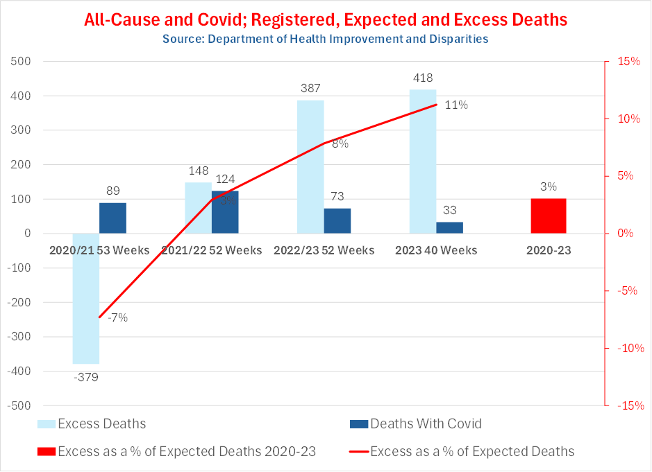 In Figure 3 excess deaths as a percentage of expected deaths are shown by the red line. Rising from a low of –7% in 2020-21 it rises to +11% by the end of 2023. Likewise, the 3% overall excess deaths for the entire 196 week period is shown by the red column on the right-hand side of the chart.