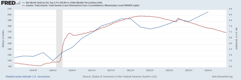 Counterintuitively, the über-wealthy owners of 0.1% of wealth in the United States, increased their net worth by a staggering $6.4 trillion over the 2022-2023 pandemic period. With their net worth growing from $12.1 trillion to $18.5 trillion, a pretty cool $20 million per head for approximately 300,000 people. This outcome is counterintuitive since the lockdowns temporarily wrecked the economy and had a significant negative impact on Government debt, which ballooned due to staggering budget deficits. All things being equal, you would expect stock markets to move lower under these circumstances.