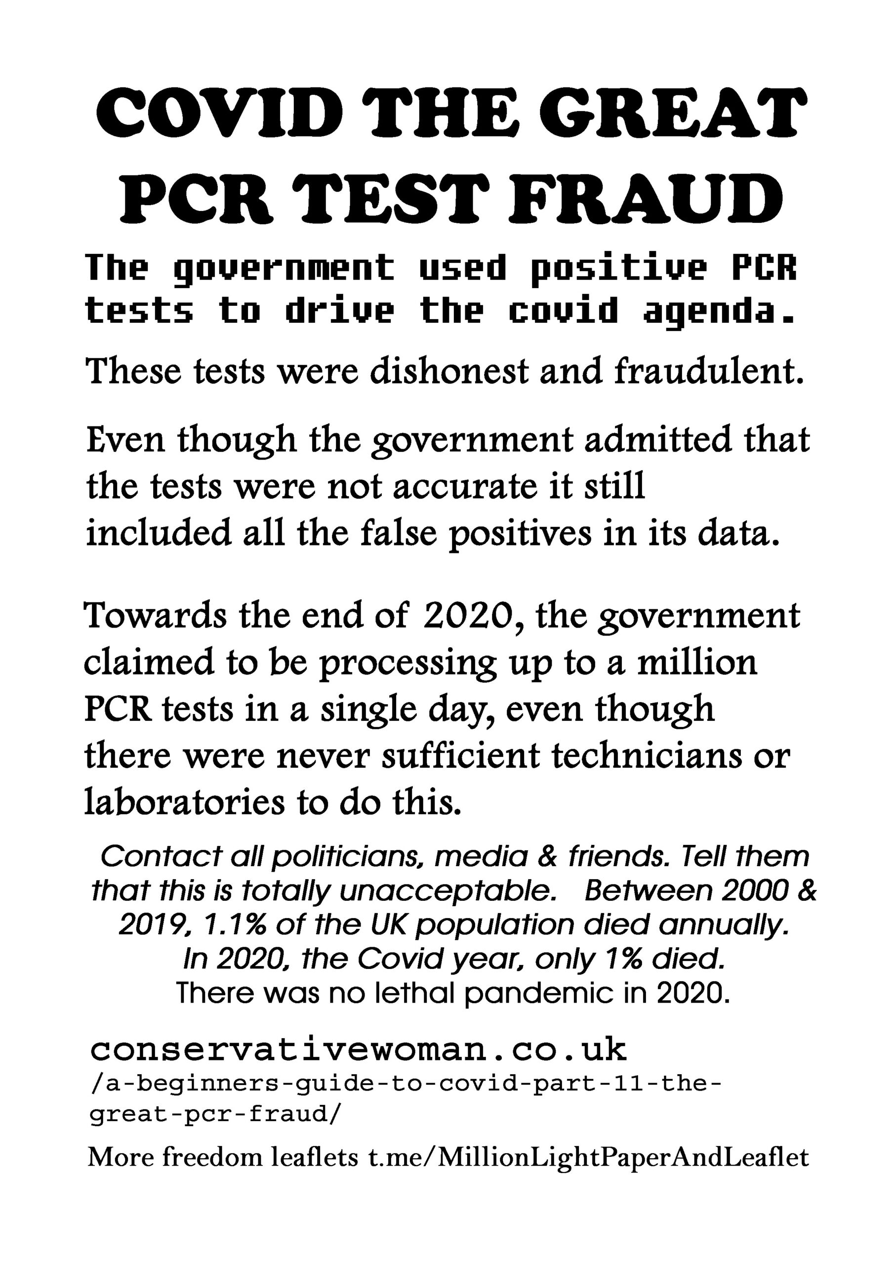 Covid The Great PCR Test Fraud – latest leaflet to print at home and deliver to neighbours or forward to politicians, your local vicar, online media and friends online. We have over 200 leaflet ideas on the link on the leaflet.
