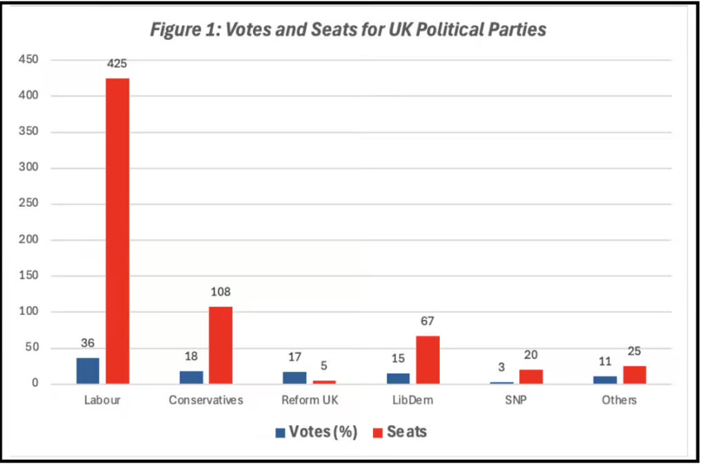 The latest YouGov U.K. poll on June 25th has Labour leading at 36%, followed by Conservatives 18%, Reform 17% and Liberal Democrats 15%. Based on these, their modelling projects Labour winning 425 of Parliament’s 650 seats (65.4%), Conservatives 108 (16.6%), Reform 5 (0.8%), and Liberal Democrats 67 (10.3%). Thus Labour with about one-third of votes would win almost two-thirds of seats; the Conservatives, level-pegging with Reform in votes, would win 22 times as many seats; Reform would win less than one-third of its vote share in seats; and the LibDems, with only four-fifths of the Reform share of votes, would have thirteen times as many seats. The extent of the distortion is shown visually in Figure 1. Another poll from People Polling actually has Reform ahead of Conservatives 24-15.