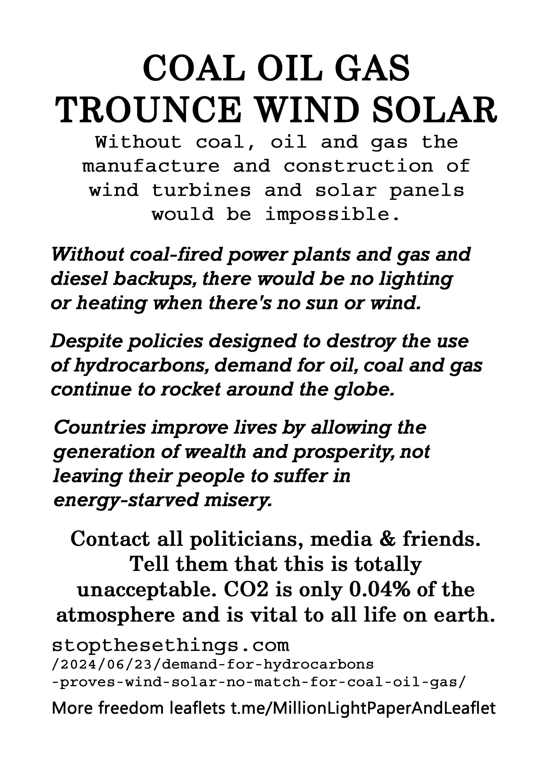 Coal Oil Gas Trounce Wind Solar – latest leaflet to print at home and deliver to neighbours or forward to politicians, your local vicar, online media and friends online. We have over 200 leaflet ideas on the link on the leaflet.