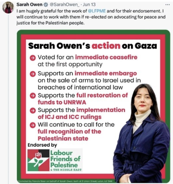 In addition to the manifestos, we have seen individual candidates calling for recognition of a Palestinian state. Labour candidate Sarah Owen is one example, tweeting her support for the Palestinian cause in the colours of the Palestinian flag.