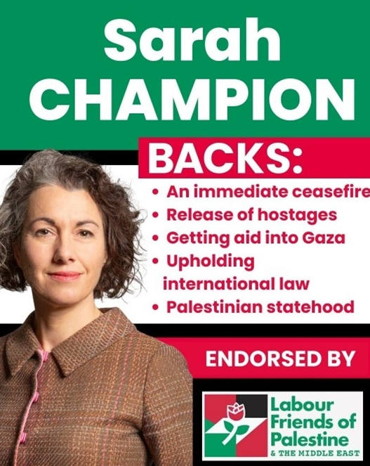 The Labour candidate Sarah Champion, who has been MP for Rotherham, has also tweeted her support for the Palestinians in a tweet with Palestinian colours.