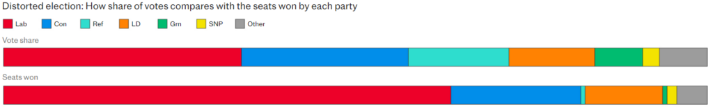 According to the Telegraph, the 30 point gap between the popular vote and seat share makes this “the most skewed result ever, far outpacing the previous 22 point gap recorded in 2001 under Tony Blair”.