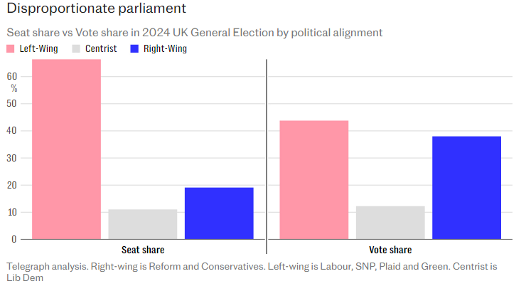 In what has been dubbed a ‘loveless landslide’ and ‘meh-jority’, Sir Keir Starmer has entered Downing Street following an election that delivered the most distorted outcome in British electoral history. Starmer’s Labour won just 33.8% of the vote, far less than Jeremy Corbyn’s 40% when he lost to Theresa May in 2017 and just 1.7% up on Corbyn’s 2019 loss to Boris Johnson. Despite winning just a third of the popular vote on the second lowest turnout since the arrival of universal suffrage at 59.9%, Starmer secured 412 seats – 63.4% of the total – for a majority of 174. It means just 20% of eligible voters – one in five – cast a ballot for the party that now controls nearly two thirds of Parliament and can make laws with little opposition.