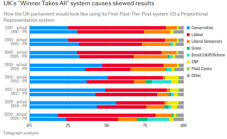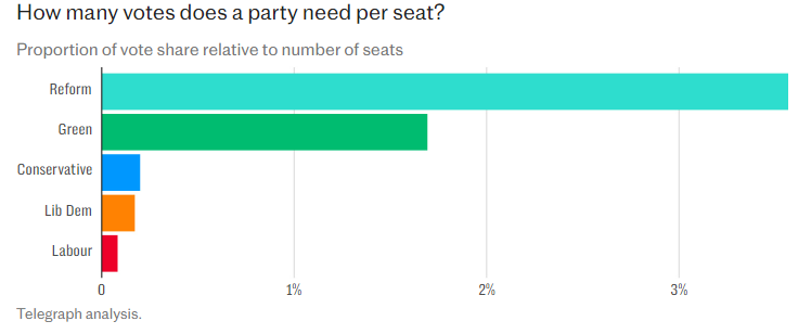 The distortion is clear when you look at votes per seat, depicted below, with Reform needing around 800,000 votes per seat, 34 times the 24,000 Labour required.