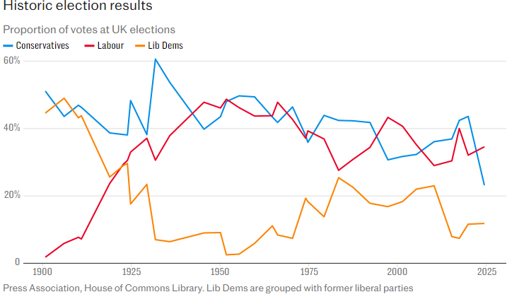 Reform garnered 4.1 million votes with 14.2% – not far off half Labour’s tally – but won just five seats.