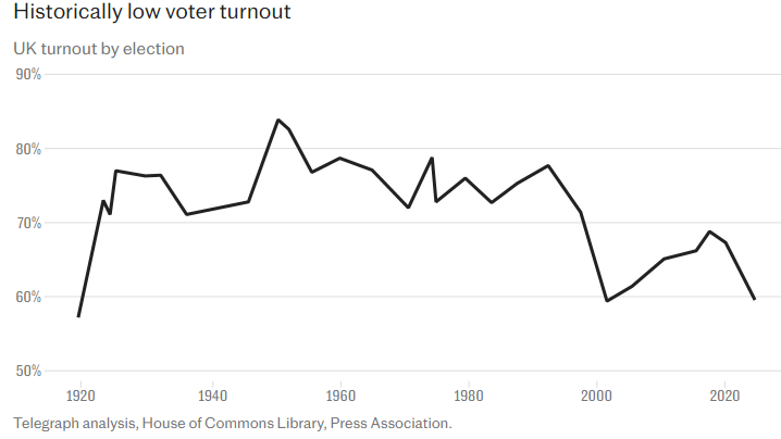 40.1% of the registered voters couldn’t be bothered about the outcome. That’s quite a bit more than backed Labour. This number does not include those who fail to register to vote. Meh. They didn’t even have to turn up – just ask for a postal vote.