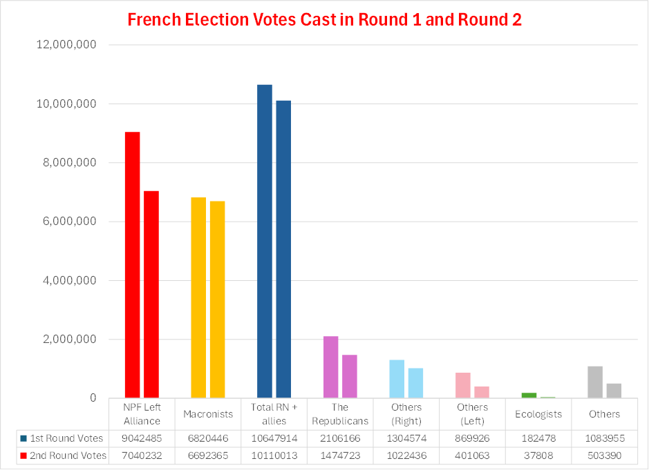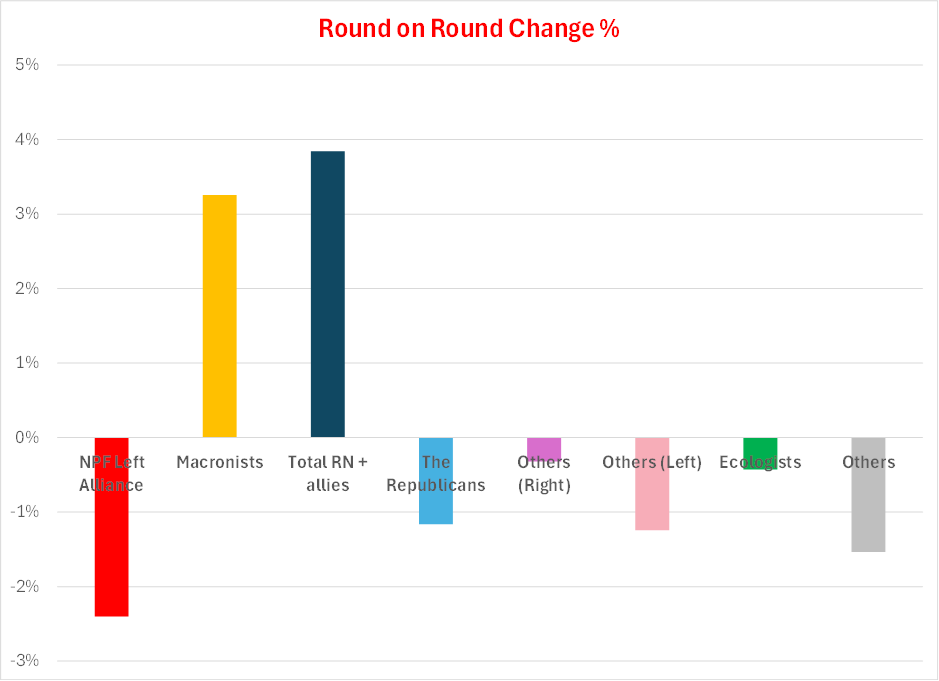 Somewhat surprisingly, Le Pen’s RN Party saw the largest second-round percentage increase in its vote share of any of the political parties or groupings.