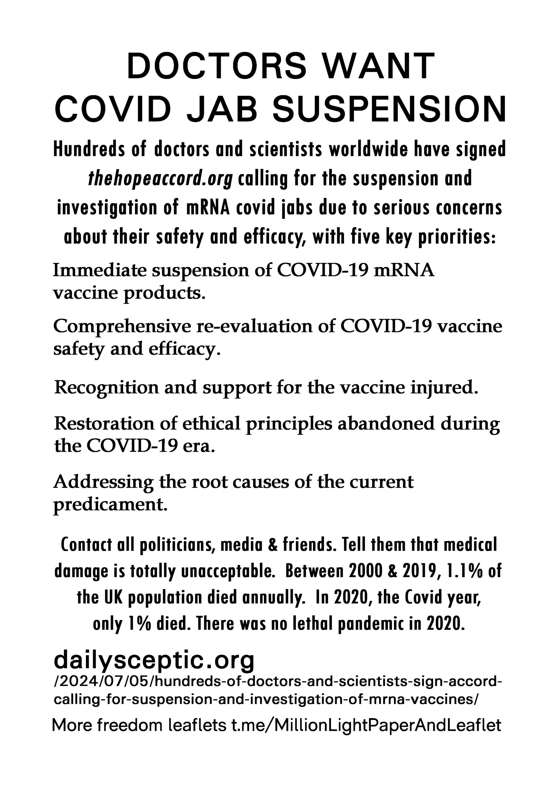 Doctors Want Covid Jab Suspension – latest leaflet to print at home and deliver to neighbours or forward to politicians, your new MP, your local vicar, online media and friends online. We have over 200 leaflet ideas on the link on the leaflet.