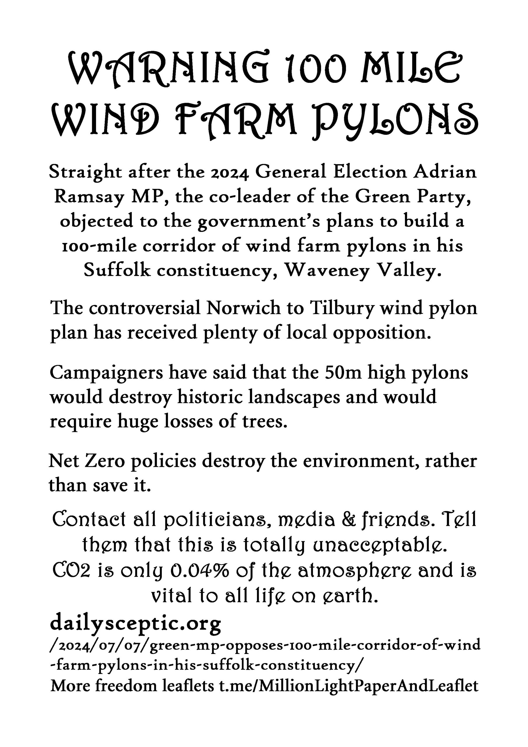 Warning 100 Mile Wind Farm Pylons – latest leaflet to print at home and deliver to neighbours or forward to politicians, your new MP, your local vicar, online media and friends online. Start a local campaign.