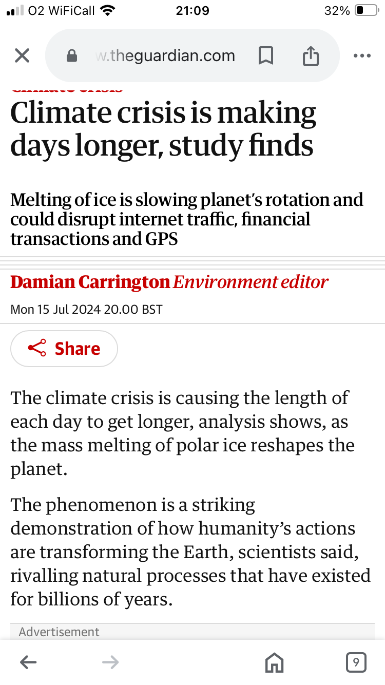 The best climate change nonsense I’ve read today was in the guardian. Apparently the climate crisis is causing the days to get longer. (Milliseconds). All to do with melting of ice caps due to melting of ice caps affecting earths shape! Had a good laugh at that one ☝️