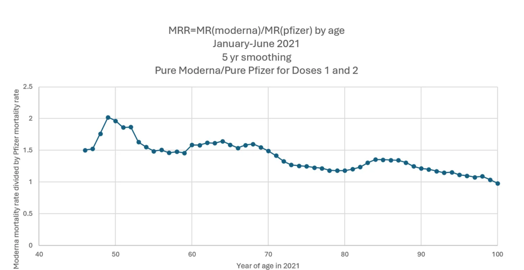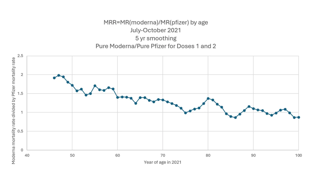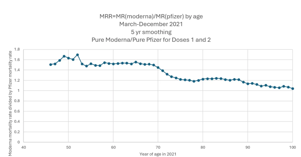The Czech Government has released record-level data for 10 million people. The clever analysis Steve has done is based on the assumption that the Pfizer/BioNTech vaccine was harmless. It can then act as a ‘placebo’ group. It is an excellent ‘placebo’ group because confounders around health and socioeconomic variables are accounted for as the brands were distributed randomly. All that is needed is to compare the overall mortality rate in the year following the first dose in the Moderna group with the Pfizer group. Barely any Moderna doses were given in January and the sick were being prioritised still in February so the graph below shows only March onwards. The x-axis is year of age and the y-axis is how much higher (or lower) the Moderna mortality rate is than the Pfizer mortality rate at that year of age, where a value of 1 means the mortality rates are the same. At all ages there were more deaths in the Moderna group – around 50% more in the non-elderly and around 20% more for those in their 70s and 80s. The impact on the young was higher, in line with the dilution effect due to higher background deaths in the old described above.