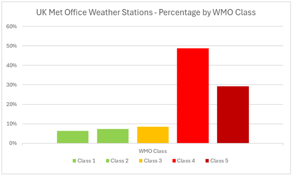 The class rating system for temperature measuring stations is set by the World Meteorological Organisation (WMO). It reflects both human and natural impacts on temperature measurements caused by nearby activities, buildings and other structures. Class 1 is pristine and in a “perfect” world can be considered a “reference” site, notes WMO. Barely 6% of the Met Office stations are Class 1. Class 4 sites are heavily corrupted by artificial temperature changing sources and come with WMO “uncertainties” of 2°C. Class 5 sites have “uncertainties” of 5°C and with no siting requirements could be located by the door of a blast furnace, or, as happens at airports, the super-heated exhausts of jet engines. Under ISO/WMO standard 19289:2014 (E), a Class 5 site “is a site where nearby obstacles create an inappropriate environment for a meteorological measurement that is intended to be representative of a wide area”.