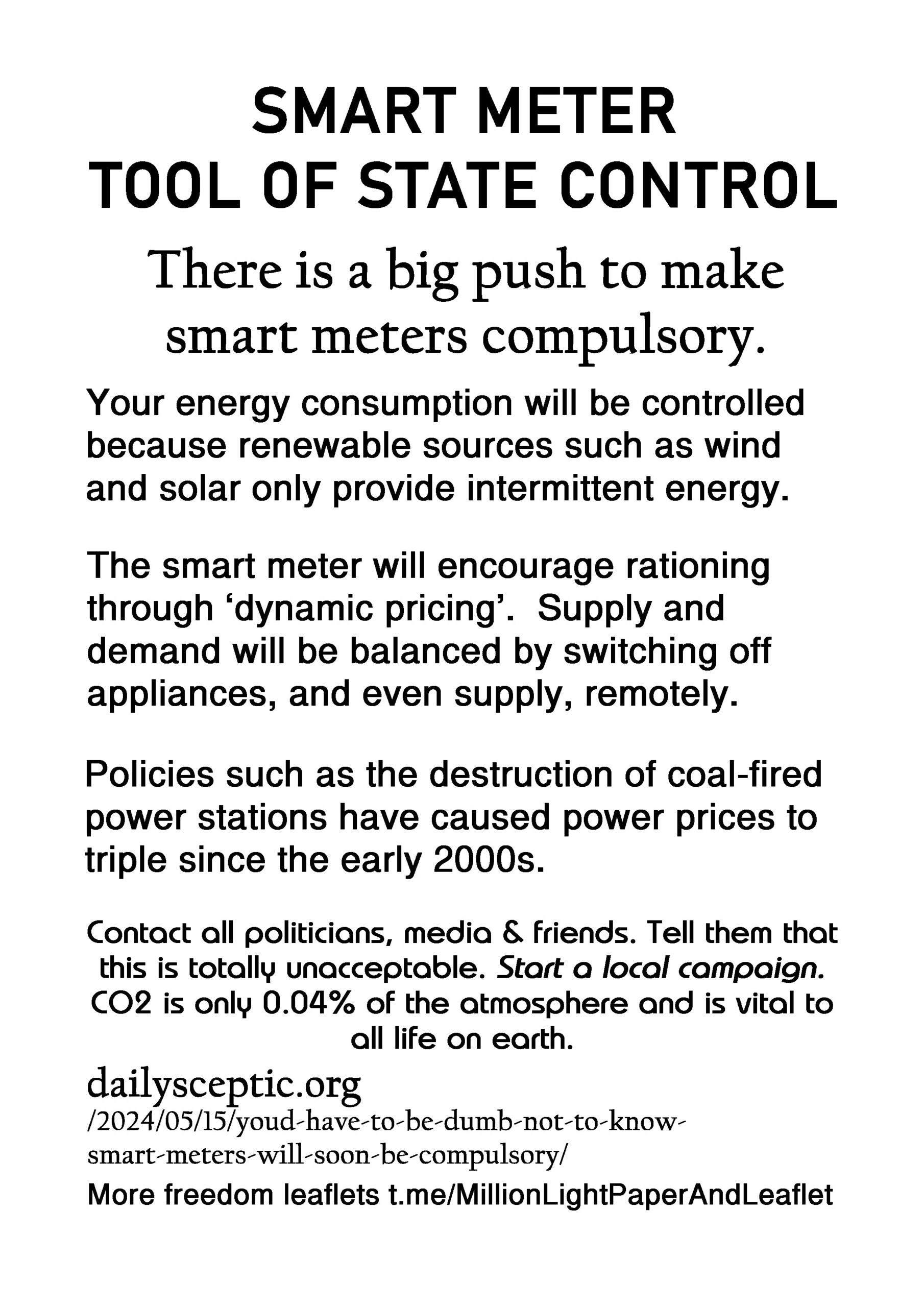 Smart Meter Tool Of State Control – latest leaflet to print at home and deliver to neighbours or forward to politicians, your new MP, your local vicar, online media and friends online. Start a local campaign. We have over 200 leaflet ideas on the link on the leaflet.