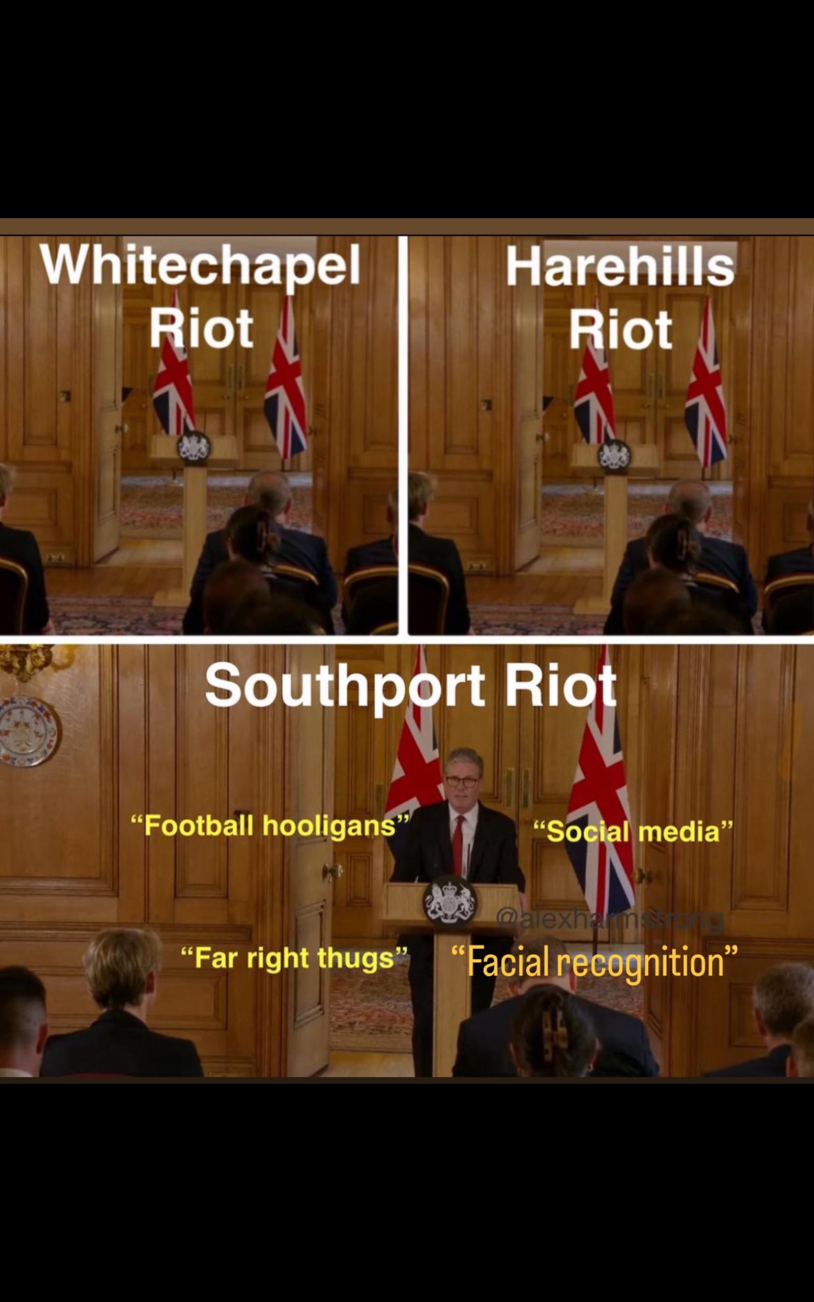 The only opportunistic political exploitation of this event (I’m aware of) was droves of labour MPs trying to hang the riots on Nigel Farage. The rioters themselve just rioted or rather, as they almost certainly believed, fought back against a system which is happy with children being murdered by knife-wielding “second generation immigrants” — Routine police operation ma’am, noting to see here! — but extremely fired up the moment white working-class people do anything in public, be it only peacefully marching somewhere with England flags. As Tommy Robinson (probably) put it: These people are scared (“feel threatened”) and angry and feel entirely left alone with that and their anger is very much justified as they are getting short shrift.
