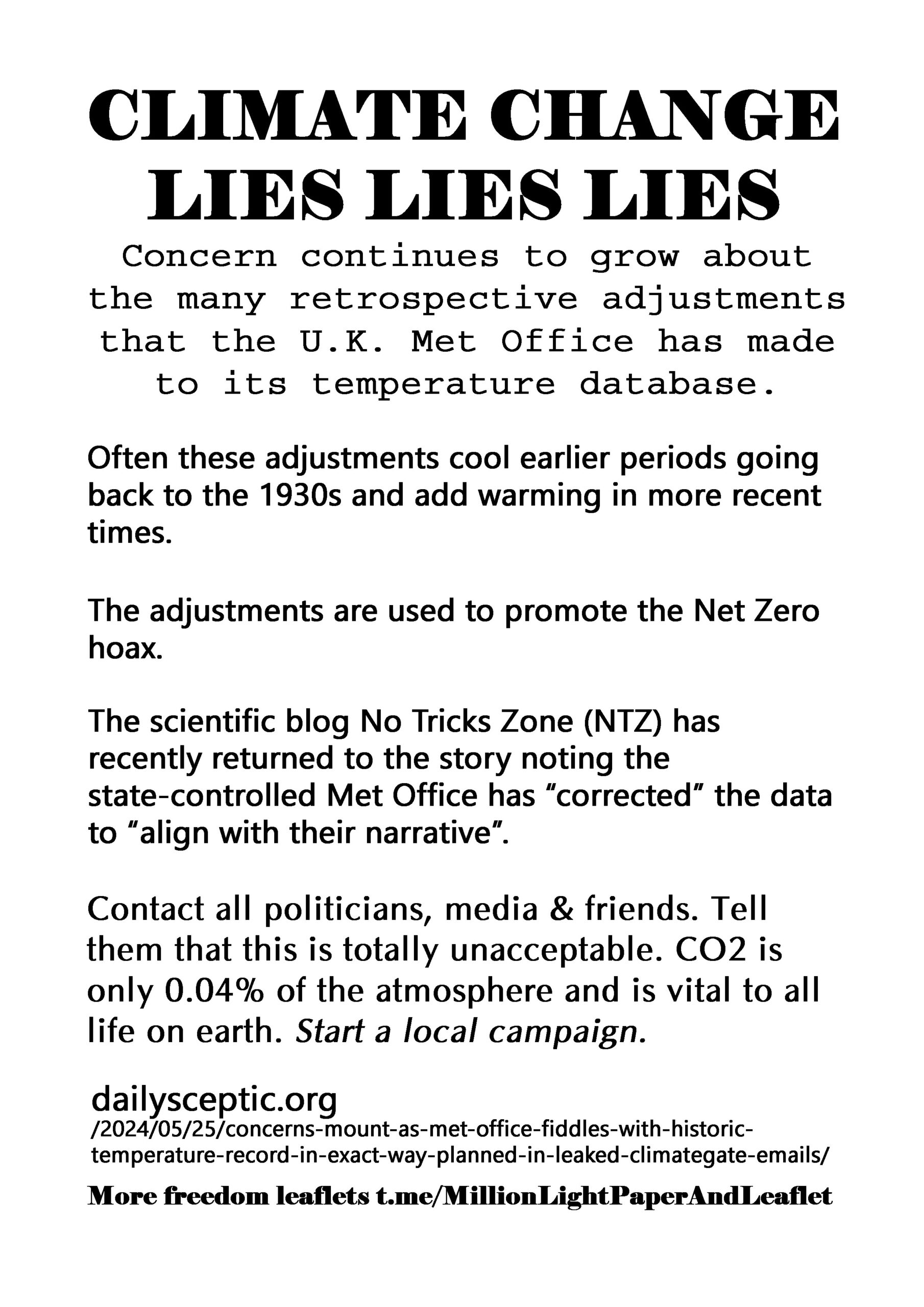 Climate Change Lies Lies Lies – latest leaflet to print at home and deliver to neighbours or forward to politicians, your new MP, your local vicar, online media and friends online.