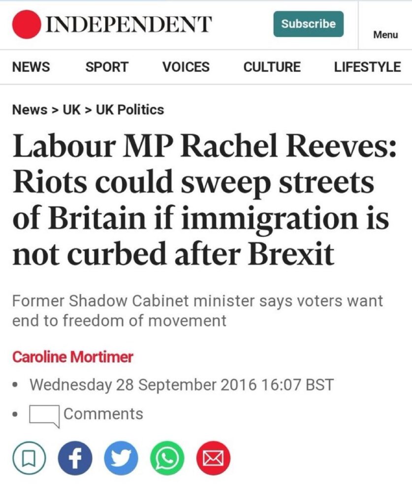 Riots Could Sweep Streets of Britain if Immigration Not Curbed – Rachel Reeves