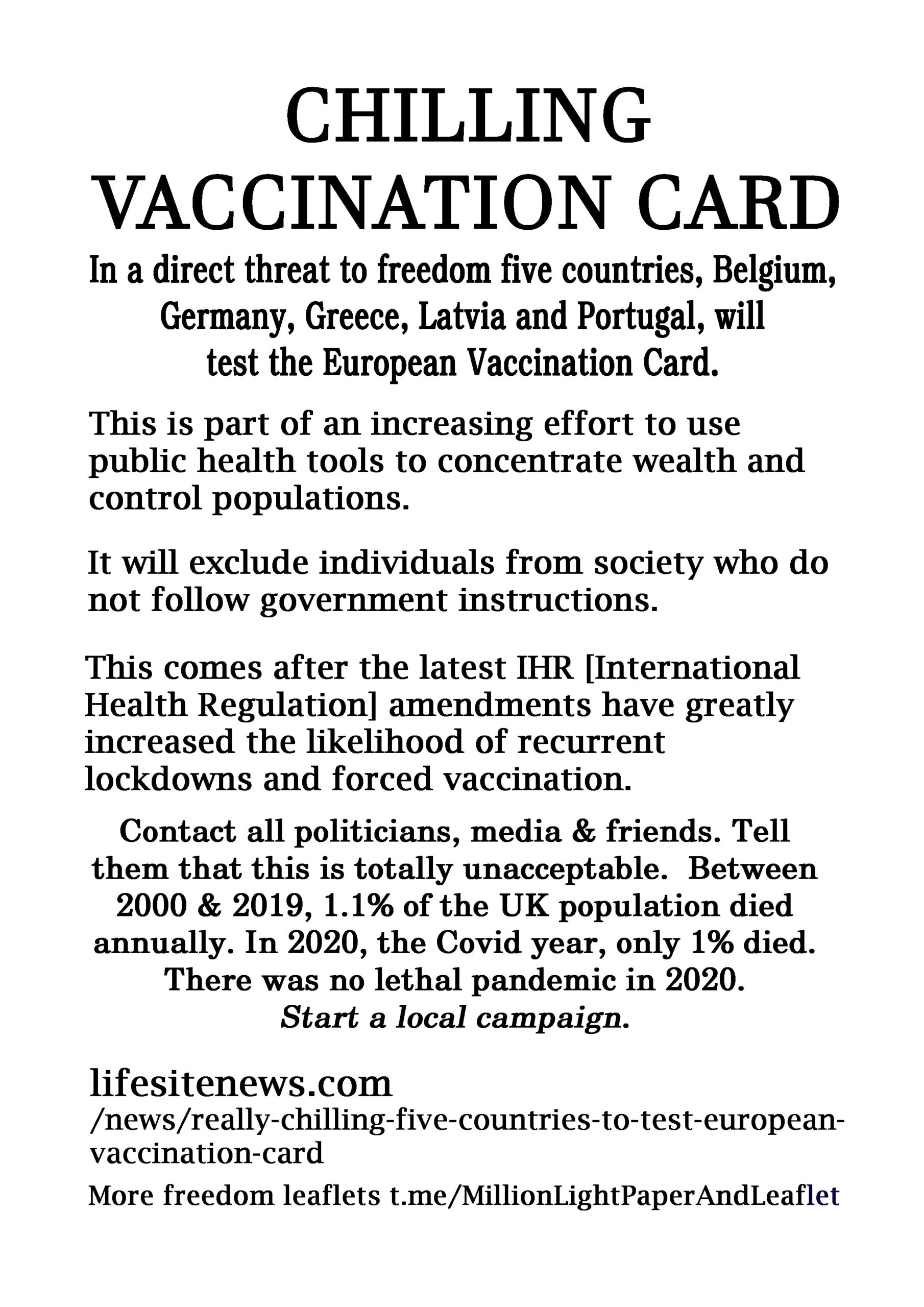 Chilling Vaccination Card – latest leaflet to print at home and deliver to neighbours or forward to politicians, your new MP, your local vicar, online media and friends online.