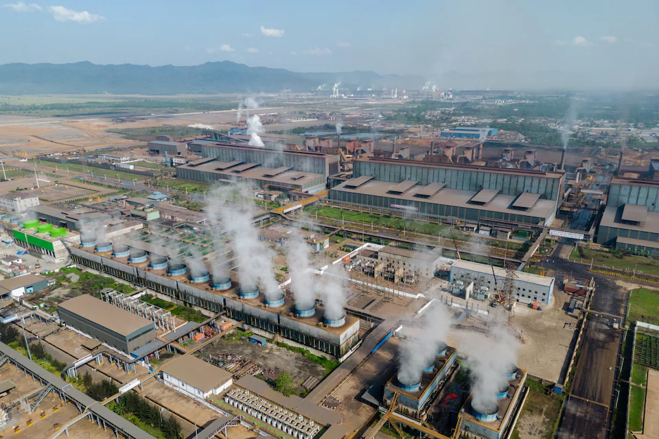The chimneys of PT Obsidian Stainless Steel, a nickel processing complex, spew smoke into the air 24-hours a day, with flames lighting up the night sky.