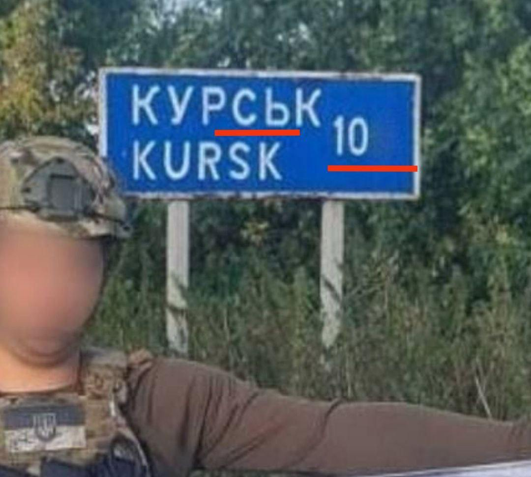 As a clue to the efficiency of Ukrainian control of their media, here is a propaganda photograph of how close their troops are from Kursk city. Unfortunately this allegedly real Russian road sign is written in Ukrainian and English but not Russian. the Russian for Kursk is Kypck.