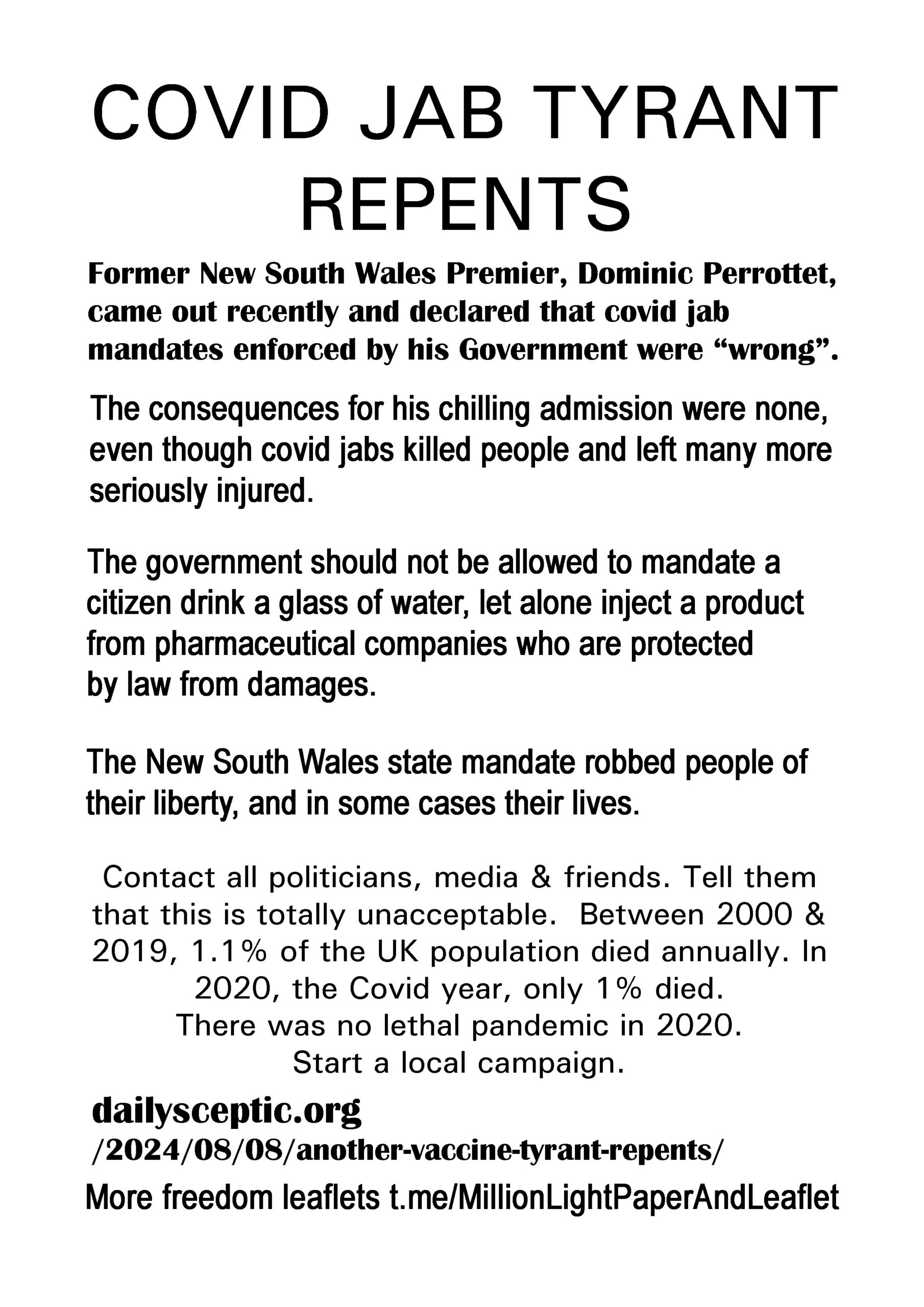 Covid Jab Tyrant Repents – latest leaflet to print at home and deliver to neighbours or forward to politicians, your new MP, your local vicar, online media and friends online.