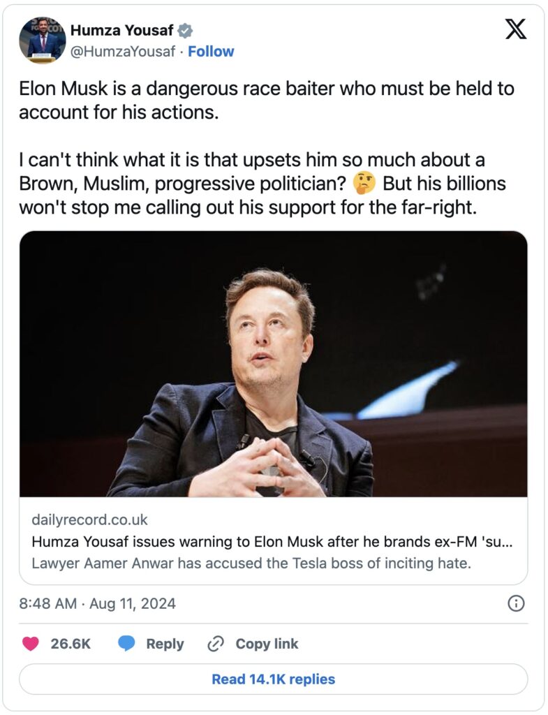 On Sunday, Mr. Yousaf shared the report on X that had raised the prospect of him taking legal action. He accompanied the link to the news story by calling Mr. Musk a “dangerous race baiter” adding that “his billions won’t stop me calling out his support for the far-Right.”