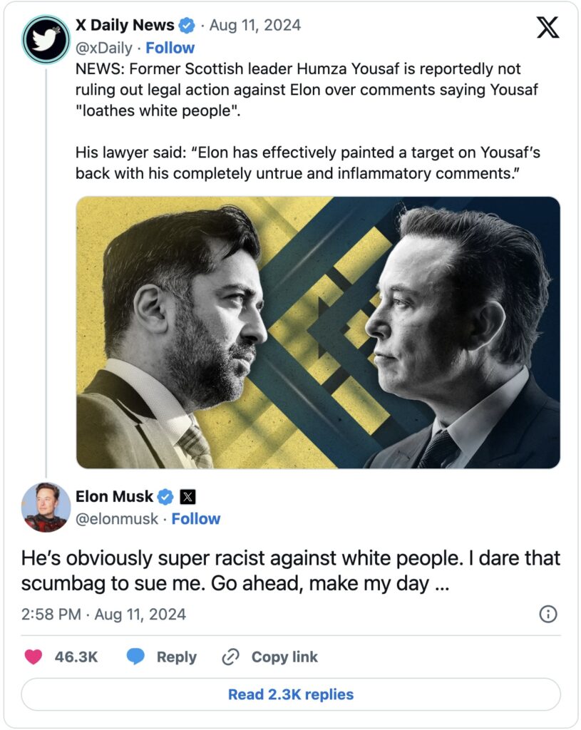 Elon Musk Brands Humza Yousaf a “Super Racist Scumbag”