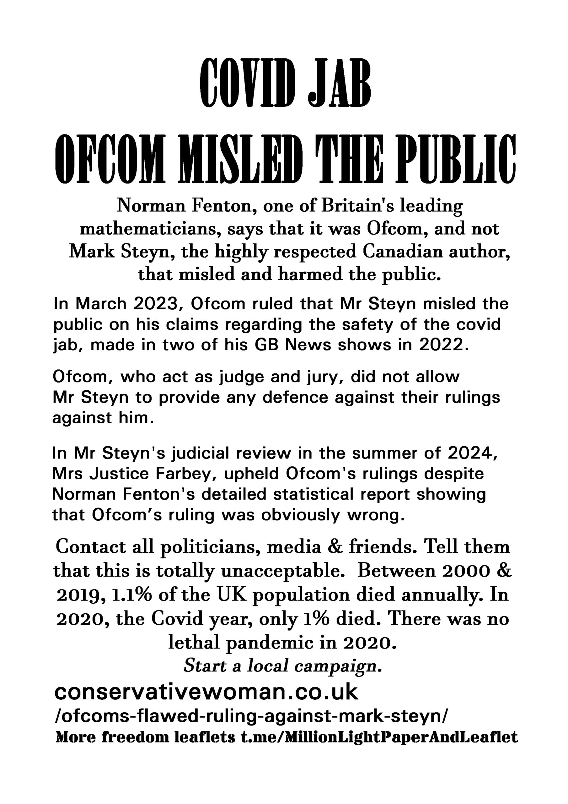 Covid Jab Ofcom Misled The Public – latest leaflet to print at home and deliver to neighbours or forward to politicians, your new MP, your local vicar, online media and friends online.