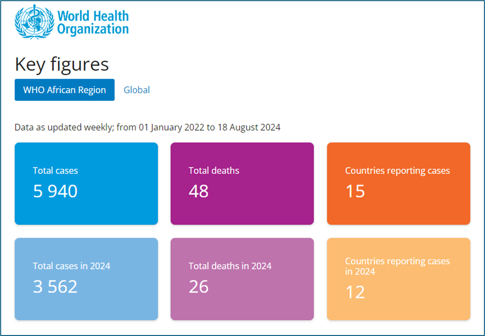 During the first six months of 2024, the 1,854 confirmed cases of Mpox reported by States Parties in the WHO African Region account for 36% (1,854 of 5,199) of the cases observed worldwide.