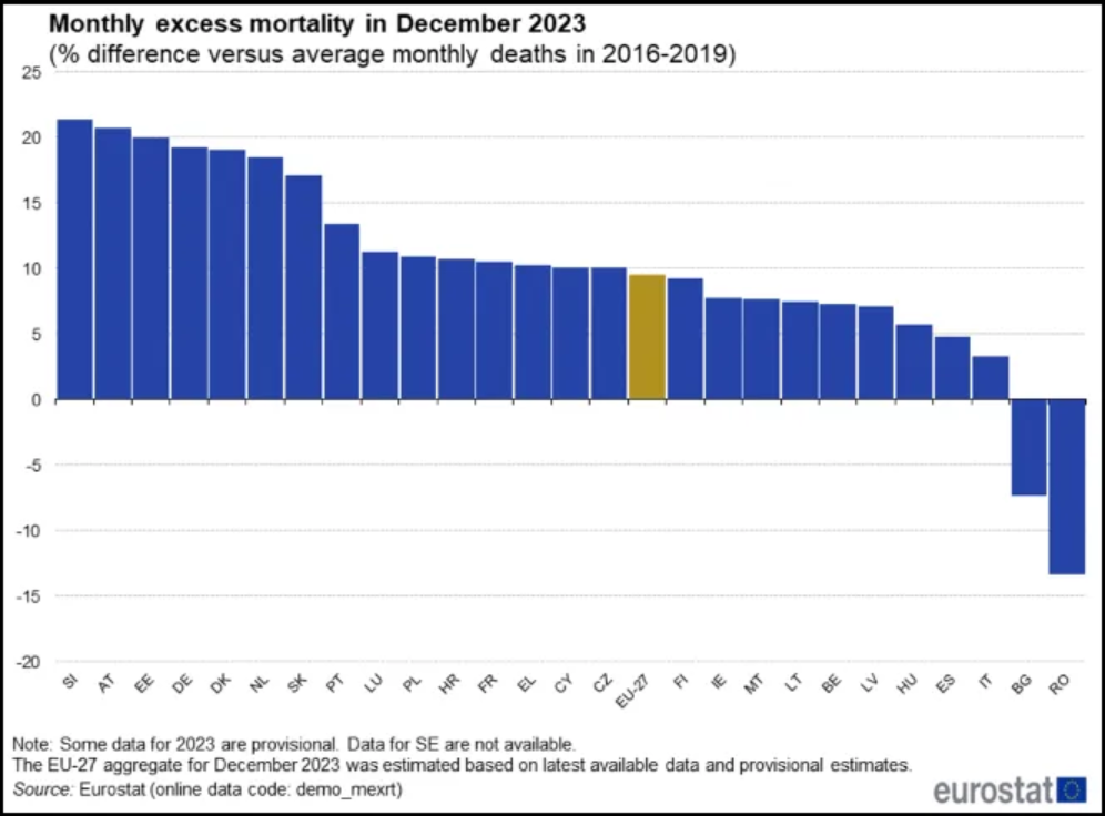 - “The percentage of people in these [European] countries receiving at least one dose of a COVID-19 vaccine was positively correlated with excess mortality, for every month between March 2023 and January 2024. The correlations ranged from weak to moderate. Almost all the values were statistically significant.”