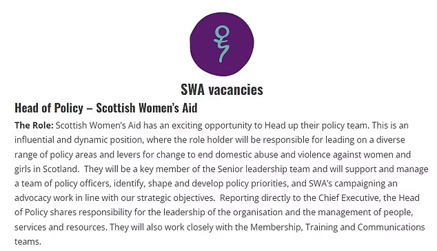 Taxpayer-funded Scottish Women’s Aid (SWA) highlights that ‘all women’ will be considered for the key policy post.