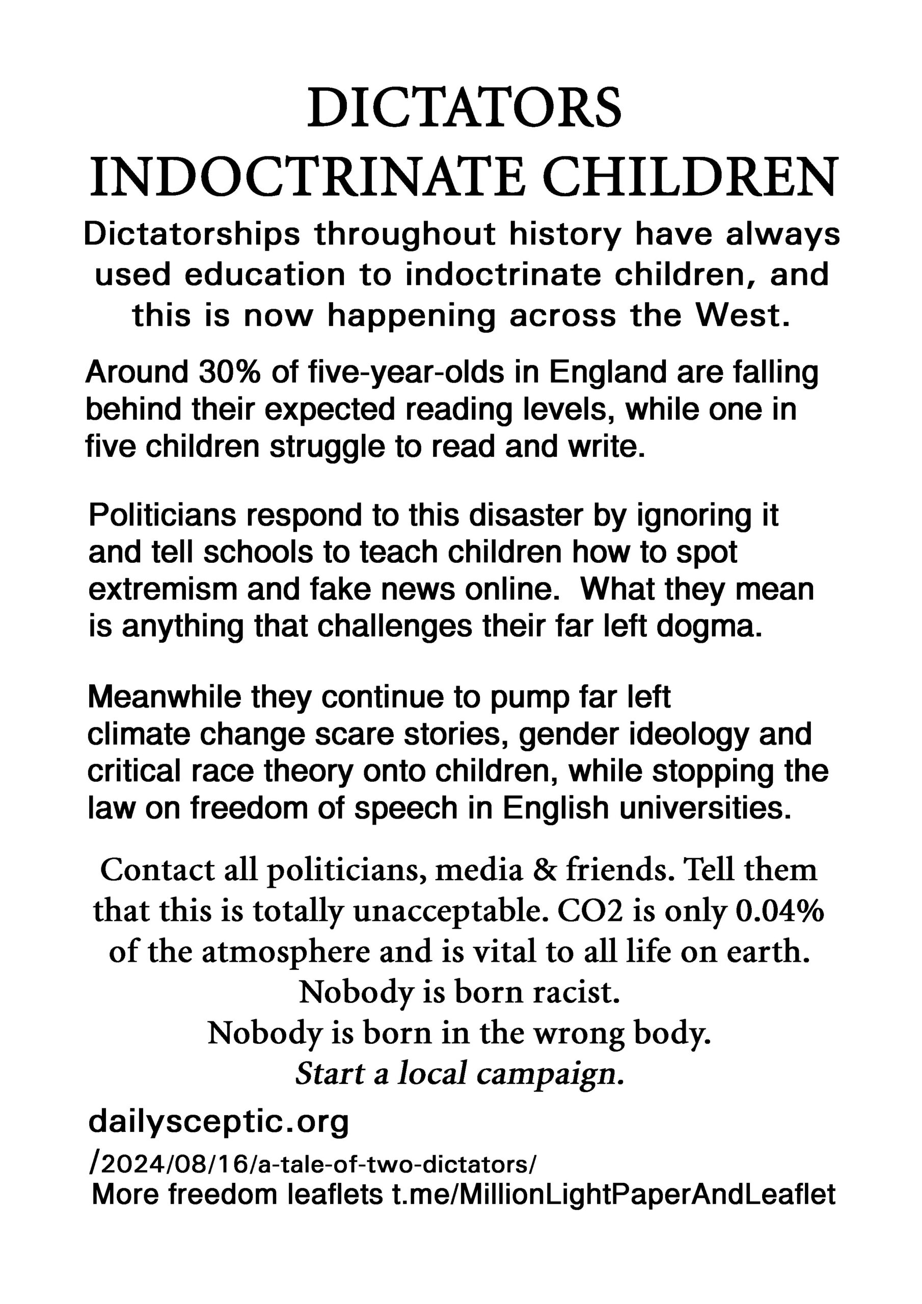 Dictators Indoctrinate Children – latest leaflet to print at home and deliver to neighbours or forward to politicians, your new MP, your local vicar, online media and friends online.