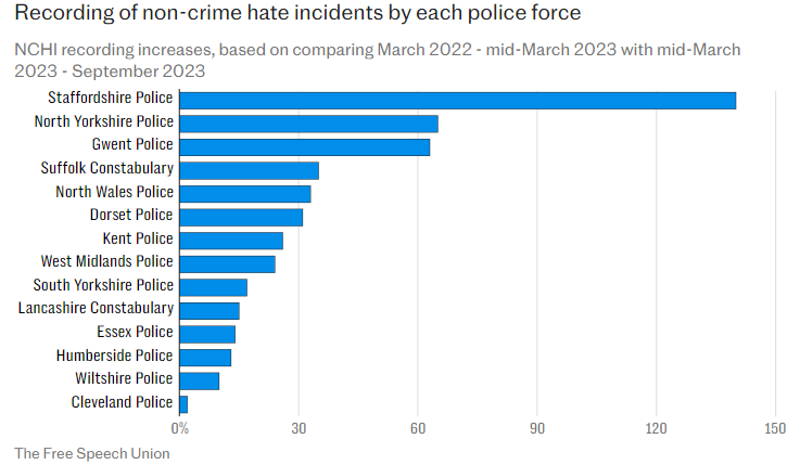 The data, provided to the Free Speech Union, revealed some forces recorded big increases including Staffordshire (140%), North Yorkshire (65%), Gwent (63%), Suffolk (35%) and North Wales (33%).