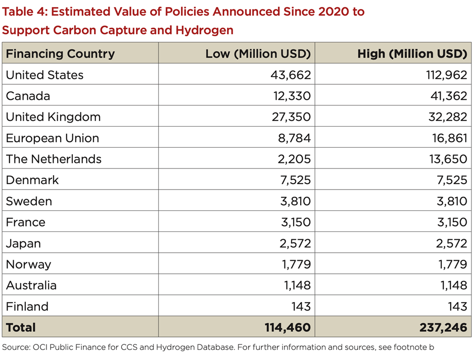 The money wasted to date on carbon capture and hydrogen is appalling, but it is a fraction of the amount of public money made available to spend in the near future. OCI claims that policies announced since 2020 could amount to over $230 billion. The table below shows the range of potential government expenditures with uncertainties due to potential tax credit claims.