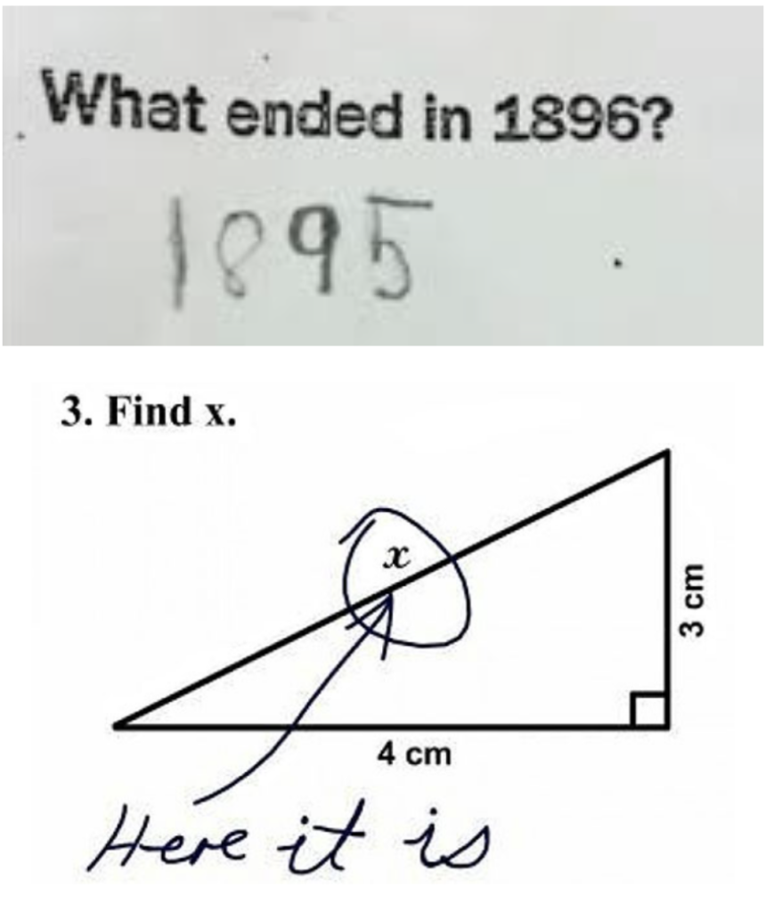 As of yet, such answers most assuredly do not make the grade. And yet, as we saw last time around, demented Left-wing moves are now afoot to essentially allow schoolchildren and university students the luxury of designing their own semi-personalised examinations and assessment schemes. To the extent that, someday, the above incredibly incorrect answers may gain actual legitimate credit simply by virtue of demonstrating the candidates’ ability – intentional or otherwise – to create witty and amusing answers rather than boring old factually correct ones. The following two would surely gain an A* in the woke GCSE grade-schemes of tomorrow: