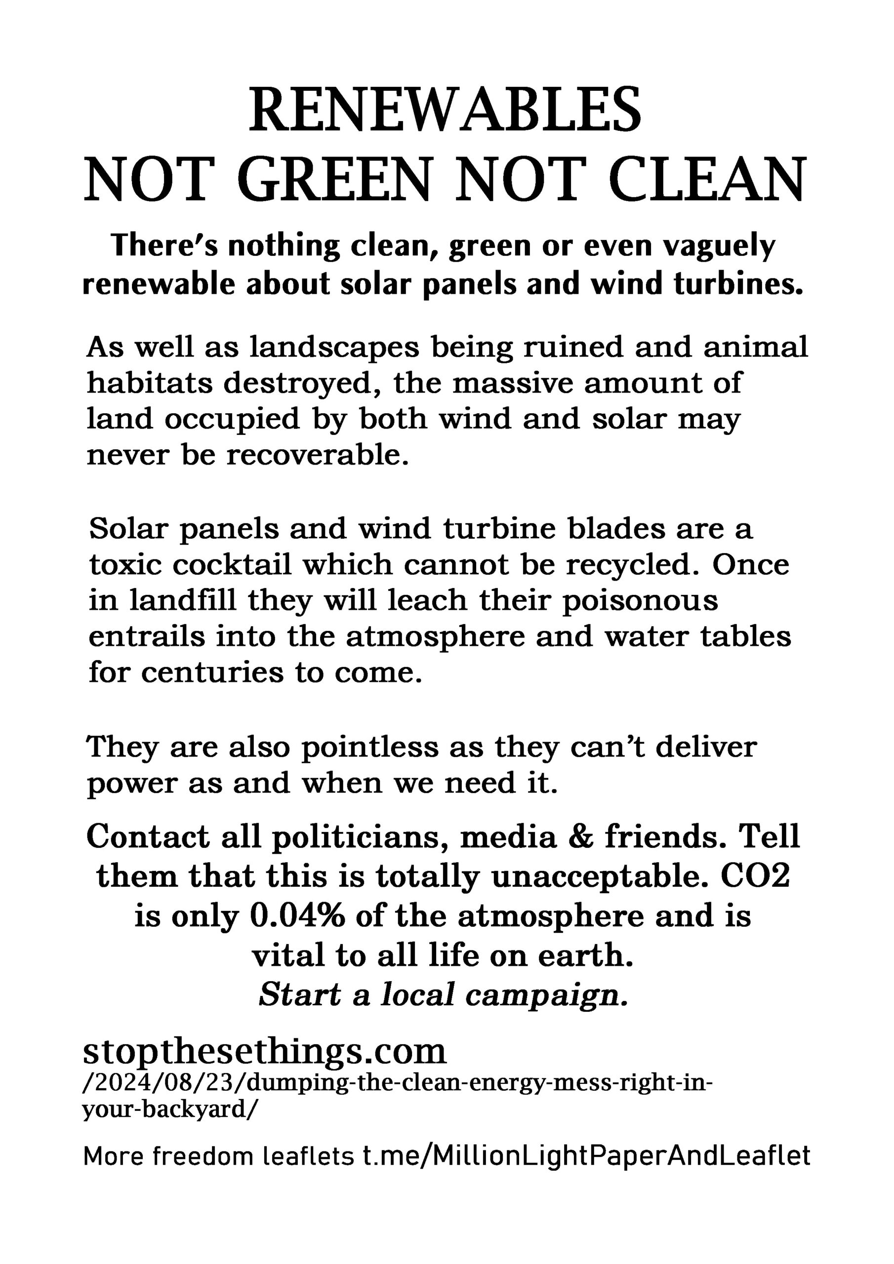 Renewables Not Green Not Clean – latest leaflet to print at home and deliver to neighbours or forward to politicians, your new MP, your local vicar, online media and friends online.