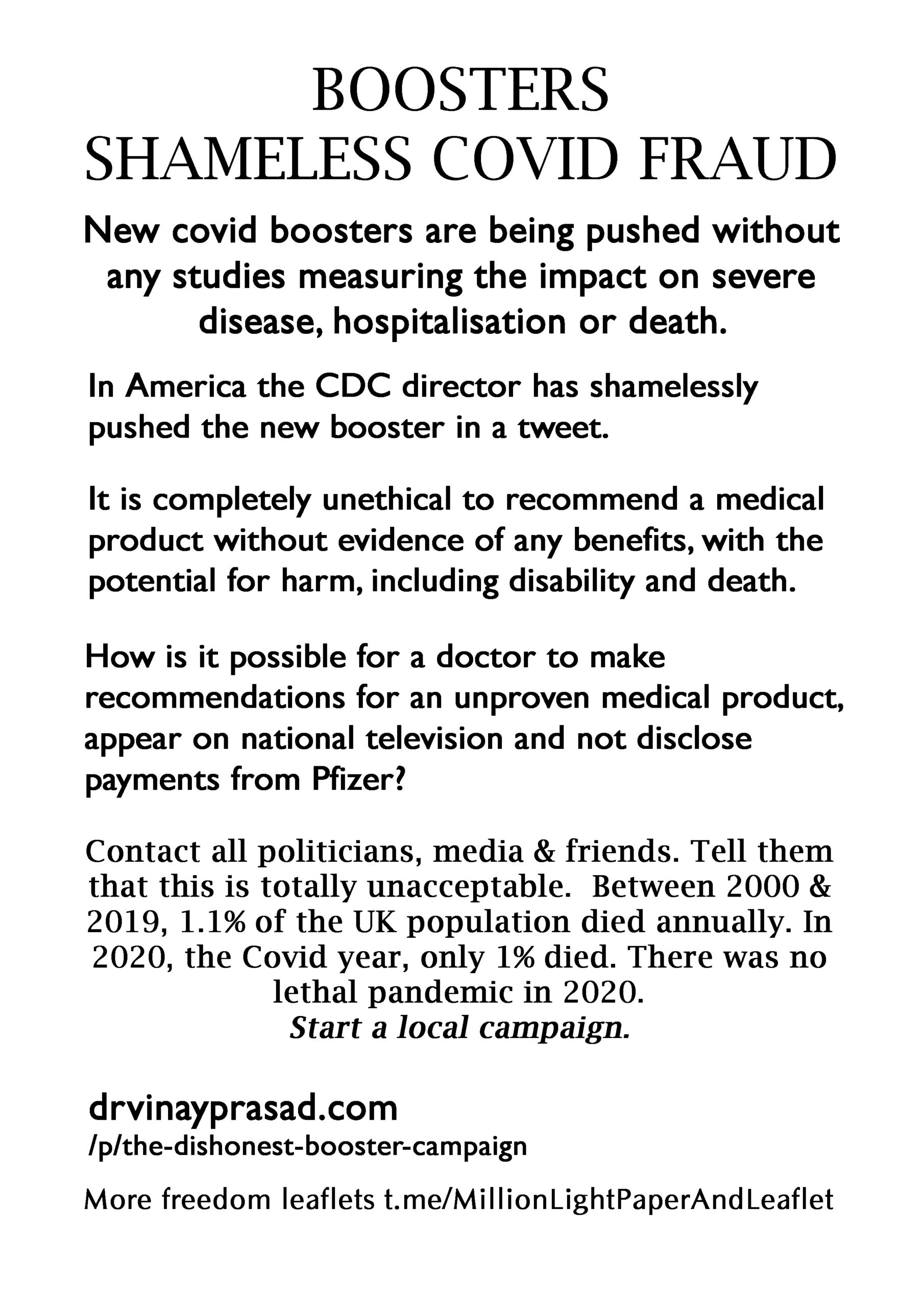 Boosters Shameless Covid Fraud – latest leaflet to print at home and deliver to neighbours or forward to politicians, your new MP, your local vicar, online media and friends online.