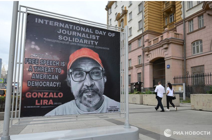 It is International Day of Solidarity with Journalists and this poster appears outside the American embassy in Moscow.