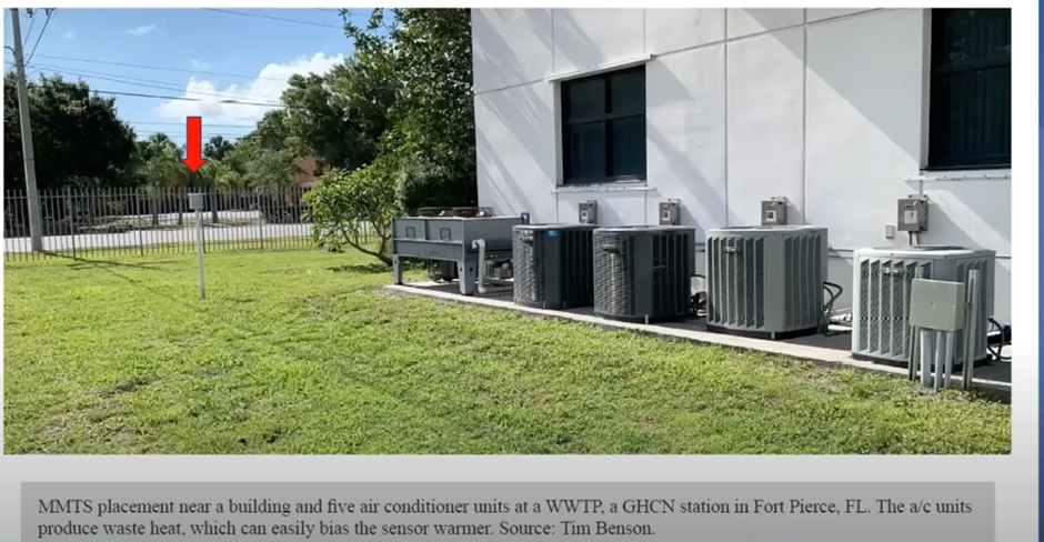 Over in the United States, meteorologist Anthony Watts has spent decades investigating the temperature output of the local weather service NOAA. He recently presented evidence to show that NOAA’s temperature data was “fatally flawed” with an astonishing 96% of 4,000 plus measuring stations corrupted by poor placement. As in the U.K., many photos of unsuitable locations have been published. The one below from a site in Florida showing measurements taken near a bank of air conditioning units is a particular horror show.