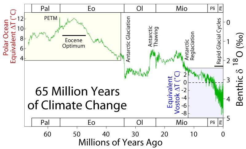 In addition Antarctic Ice began forming about 34 million years ago while Arctic Ice about 2.7 million years and the Tibetan Plateau about 2.5 million years. The reason given for the Antarctic freezing is that India collided with Eurasia pushing up the Himalayas around 35 million years and this cause a draw down of CO2. Interesting hypotheses except I would have thought both poles would have frozen at the same time as CO2 is distributed fairly evenly around the globe.