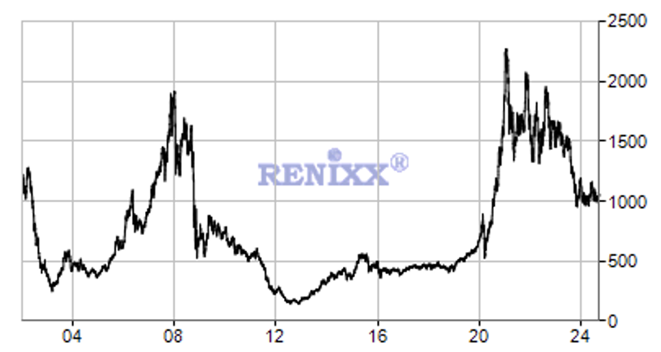 The RENIXX covers a broad spectrum of activities including wind power manufacture and supplies, along with producers of solar PV cells. Current members of the Index include Orsted, Tesla and Vestas Wind Systems. The stock of this latter company has risen only 7% over the last 16 years and it has fallen 58% from a high in 2021. Typical of the RENIXX dogs is the U.S. operation First Solar which has risen since 2021 but is below its all-time high price reached in 2008.
