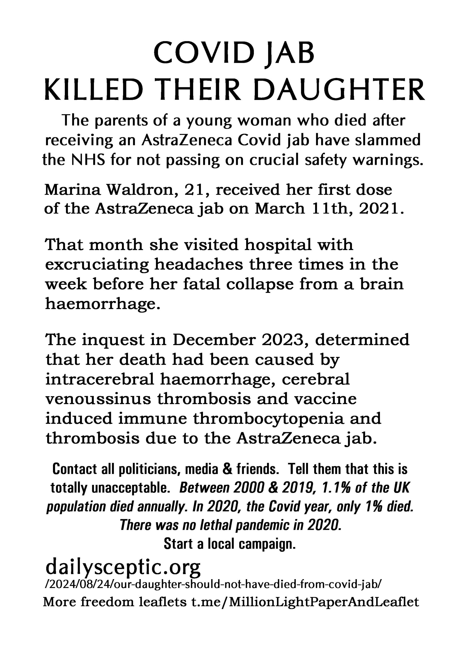 Covid Jab Killed Their Daughter – latest leaflet to print at home and deliver to neighbours or forward to politicians, your new MP, your local vicar, online media and friends online.