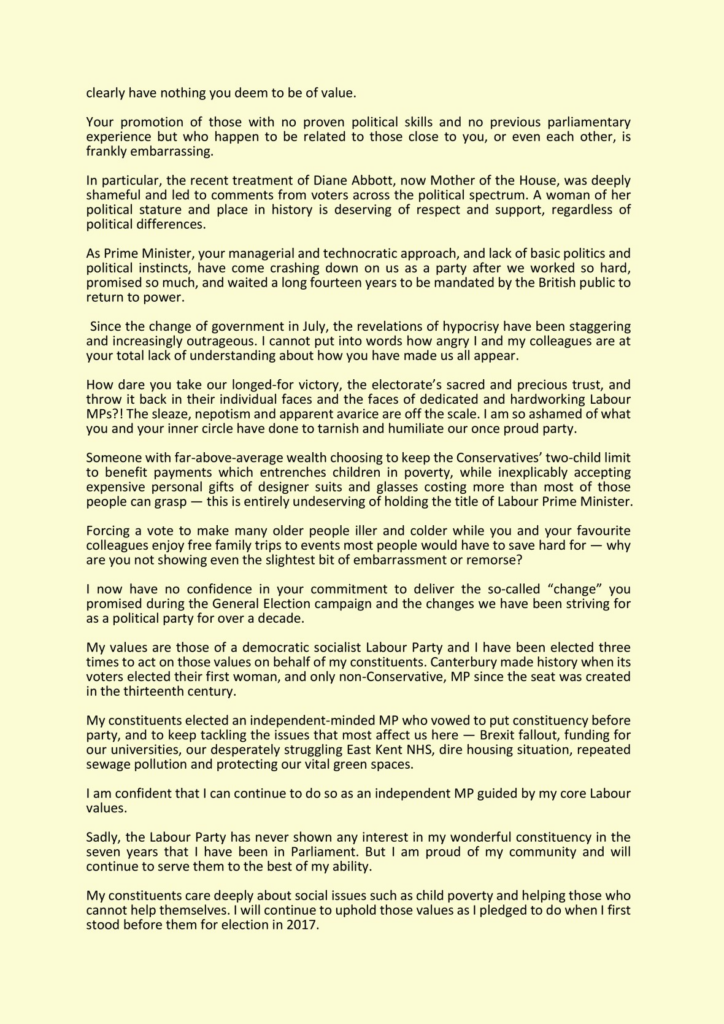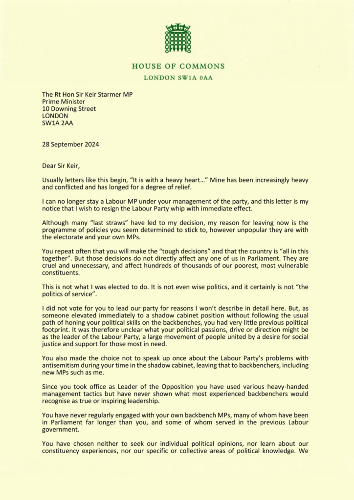 Normally a resignation letter like this will deeply unsettle a party. Unfortunately I don’t think Starmer will give a damn.