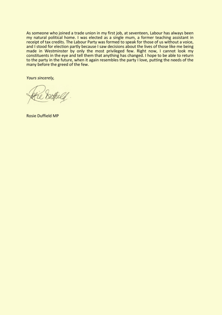 In her resignation letter to the Prime Minister, Ms. Duffield said: “Someone with far above average wealth choosing to keep the Conservatives’ two-child limit to benefit payments which entrenches children in poverty, while inexplicably accepting expensive personal gifts of designer suits and glasses costing more than most of these people can grasp – this is entirely undeserving of holding the title of Labour Prime Minister.