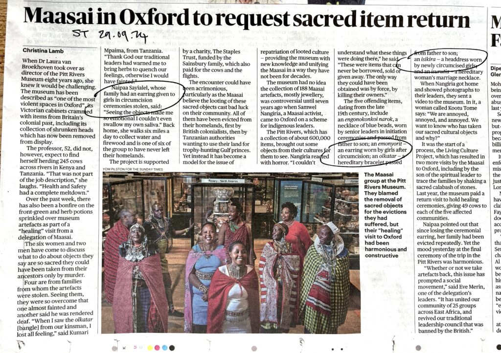 She reports that the University of Oxford’s Pitt Rivers Museum’s is currently playing host to a group of Maasai women from East Africa in search of “sacred objects” taken from their ancestors. These include “an emonyorit – an earring worn by girls after circumcision” and “an isikira – a headdress worn by newly circumcised girls”.