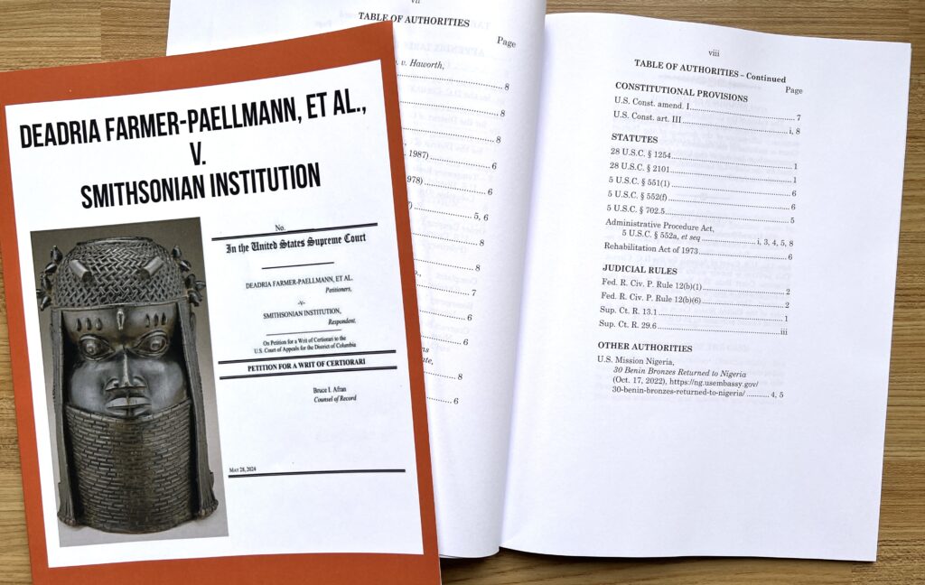 Stop Press: The U.S. Supreme Court gets over 7,000 petitions a year, asking it to grant a writ of certiorari, and typically accepts only 100-150 of them for hearing. Whether the RSG’s petition against the Smithsonian Museum will be among them is due to be decided this week and presents the court with an interesting challenge to its impartiality. The Smithsonian’s Regents voted in April 2023 to hand over the museum’s Benin bronzes to Nigeria (not the Oba): these trustees include Vice President Kamala Harris and the Supreme Court’s own Chief Justice, Honorable John G Roberts Jr. – neither of whom were present for that vote, as it happens.