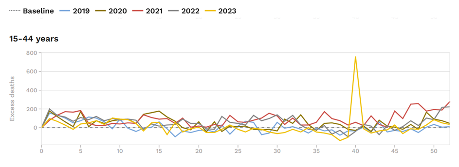 During Covid, when a supposedly ‘once in a century’ virus was running rampant across Europe, on only five occasions did excess deaths among those 150 million 15-44 year-olds even marginally exceed 200. Incidentally, all five of these occurrences happened in late 2021 and in 2022, after the completion of the vaccine rollout.