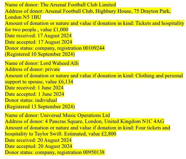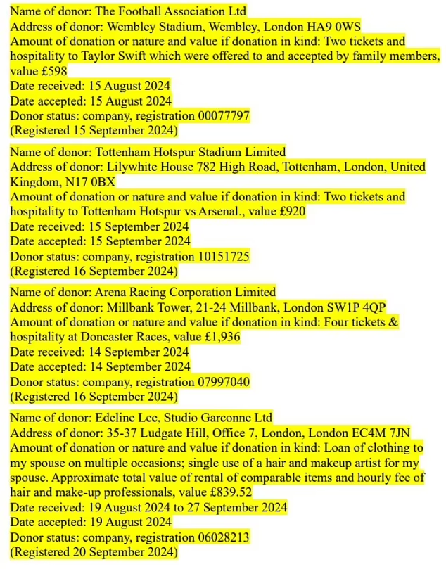 “Gifts paid for by Sir Keir include four Taylor Swift tickets from Universal Music Group totalling £2,800”