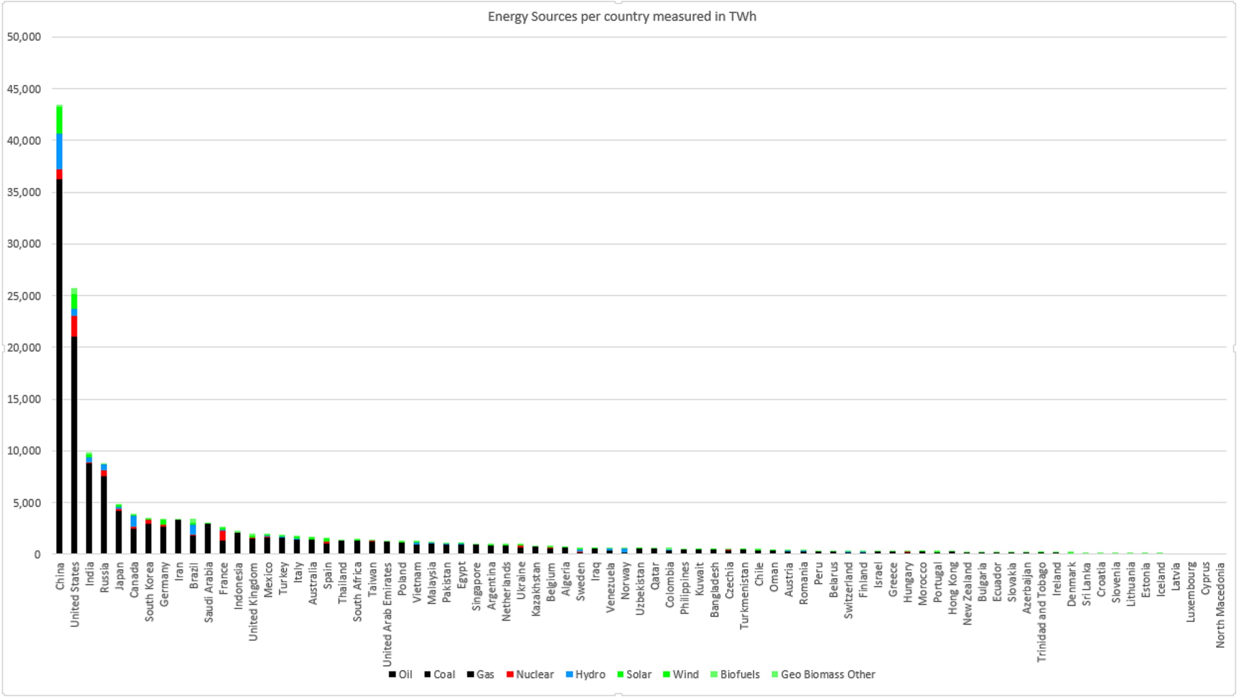 Below is a table showing each countries energy production by source. Fossil (coal, oil gas) is shown in black (of course), hydro – blue, Nuclear – red, renewables – green.